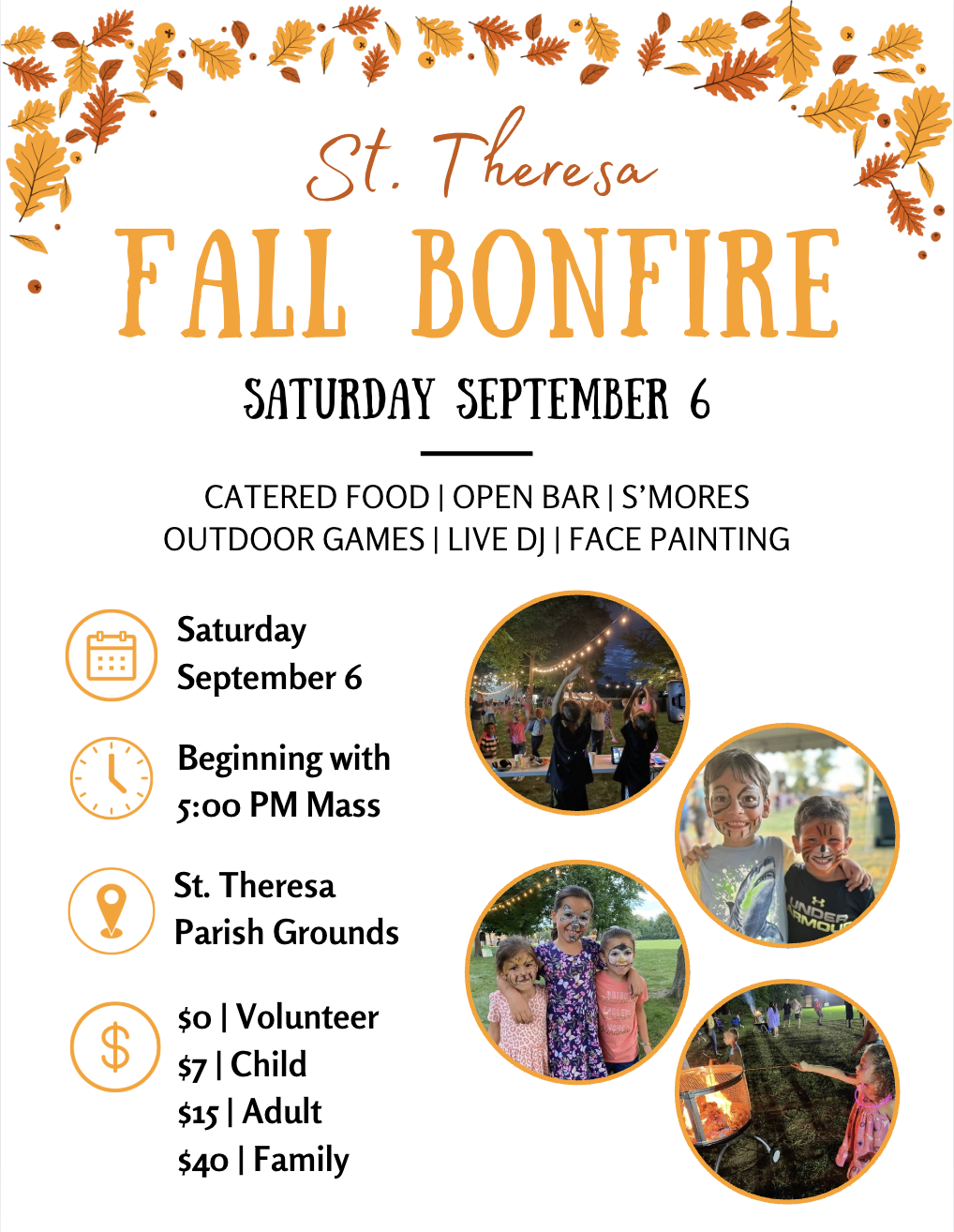 The event will be held on School grounds in the back of the church and school. Join us for 5PM Mass, stay for the Bonfire immediately following - See below link to purchase tickets