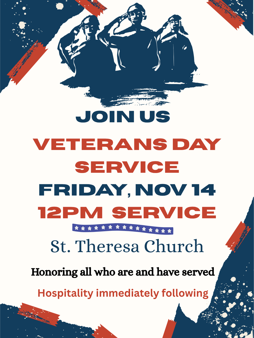 Veterans Day Service, Friday Nov 14 Join us for our annual Veterans Day Service on Friday, Nov 14 at Church. Refreshments will be available in the gathering space immediately following. Print